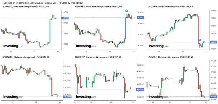 En América Latina, las monedas locales experimentaron una fuerte apreciación frente al dólar. Específicamente, el peso mexicano (USD/MXN), el peso colombiano (USD/COP) y el peso chileno (USD/CLP) se fortalecieron de manera significativa al cierre de la semana. Este comportamiento indica un regreso de los inversores a los activos de riesgo en la región, en un contexto de incertidumbre global y las señales de cautela de la Fed.