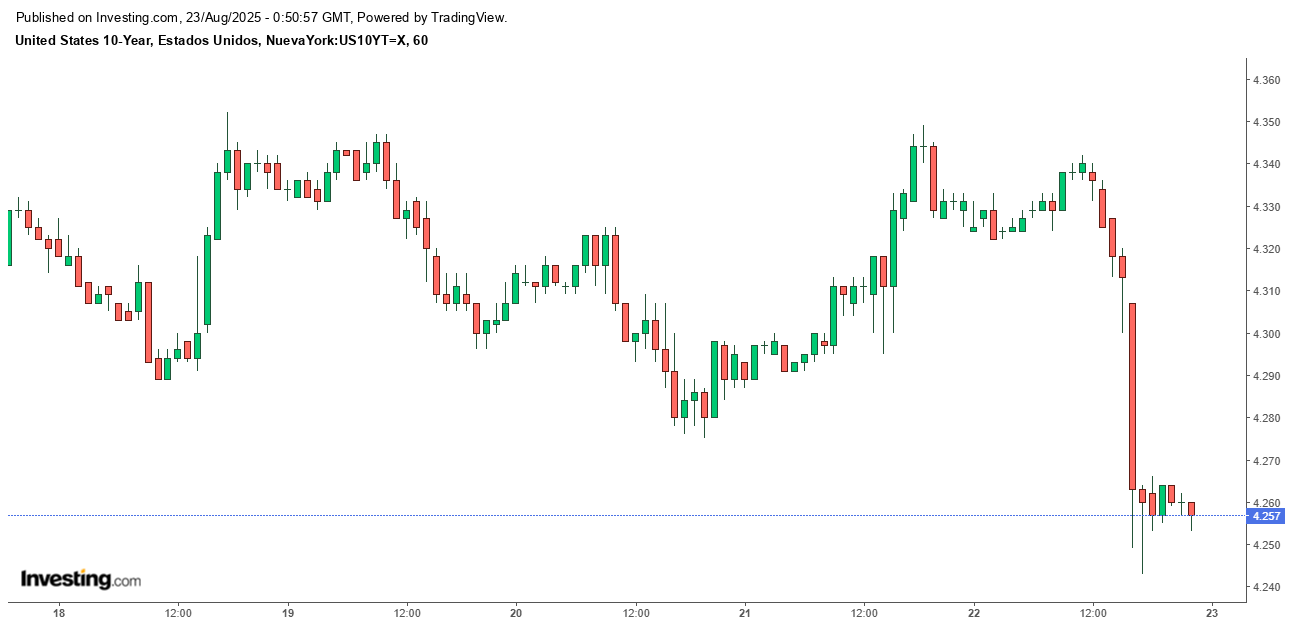 El rendimiento del bono del Tesoro de EE. UU. a 10 años es uno de los indicadores más vigilados, ya que su movimiento suele reflejar las expectativas de crecimiento económico e inflación. Al final de la semana, el rendimiento de este bono cayó de forma notoria, lo que sugiere un cambio en el sentimiento de los inversores. Esta caída en el rendimiento es una clara señal de que el mercado está descontando una mayor probabilidad de futuros recortes de tasas de interés por parte de la Fed, lo que genera un retorno de la confianza en los activos de renta fija a largo plazo.