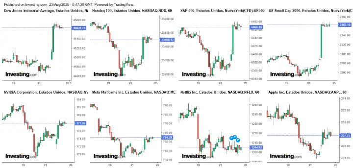 La semana cerró con fuertes ganancias para la bolsa de valores de Estados Unidos. Los principales índices de Wall Street, como el Dow Jones, el S&P 500 y el Nasdaq 100, experimentaron un notable repunte. Este crecimiento fue impulsado en gran medida por el sector tecnológico, que mostró una marcada fortaleza. Empresas como Nvidia, Meta, Netflix y Apple cerraron la semana con movimientos alcistas, contribuyendo al optimismo general del mercado. El discurso de Jerome Powell en Jackson Hole y la percepción de una política monetaria más "dovish" fueron factores clave que alentaron a los inversores.
